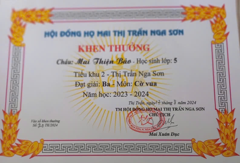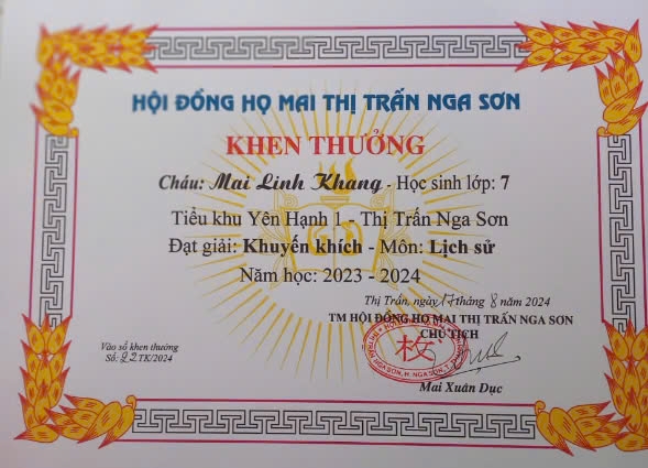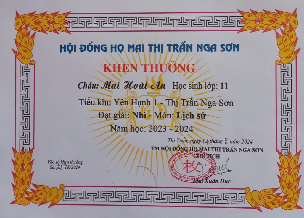 Sáng ngày 17/8/2024 (Tức ngày 14/7 năm Giáp Thìn), Tại Hội trường Nhà Văn hóa Thị trấn Nga Sơn, huyện Nga Sơn, tỉnh Thanh Hóa. Hội đồng Họ Mai Thị trấn Nga Sơn tổ chức Lễ trao thưởng cho các cháu Học sinh là con cháu Họ Mai đạt thành tích xuất sắc trong năm học 2023 - 2024.