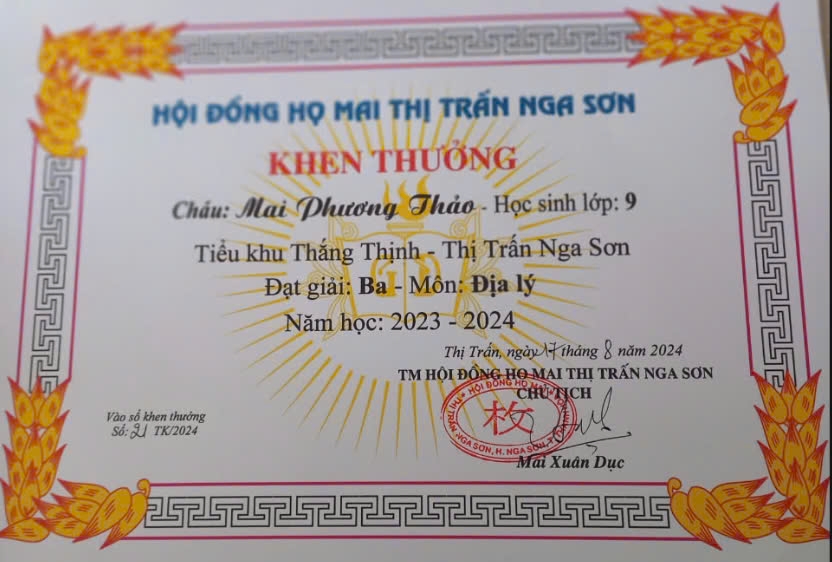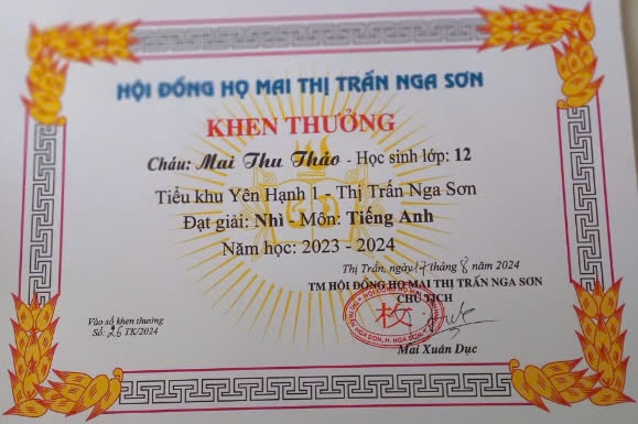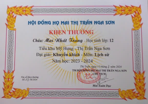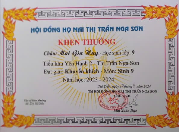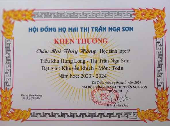 Năm học 2023 - 2024, Hội đồng Họ Mai Thị trấn Nga Sơn đã Biểu dương khen thưởng cho 47 cháu đạt giải học sinh giỏi cấp tỉnh và cấp huyện, trong đó có 9 cháu học sinh đạt giải thi học sinh giỏi cấp tỉnh (3 giải nhì, 02 giải và 4 giải khuyến khích). Tổng số tiền thưởng là 2,7 triệu đồng.