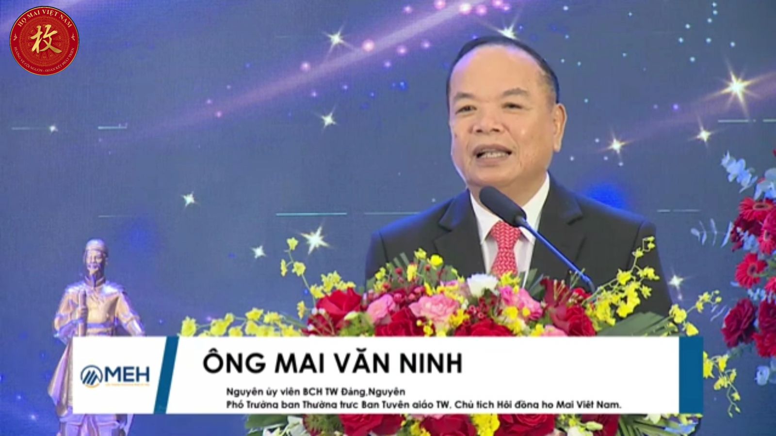 Và chương trình nhận được sự phát biểu động viên của chủ tịch hội đồng họ Mai Việt Nam. Trong lời phát biểu tâm huyết của chủ tịch, ông Ninh đã khái quát giá trị cốt lõi và định hướng phát triển của Hội Doanh Nhân họ Mai. Đồng thời chủ tịch cũng nêu ra gợi ý sứ mệnh và nhiệm vụ của hội, sự kỳ vọng vào hội doanh nhân họ Mai Hà Nội.