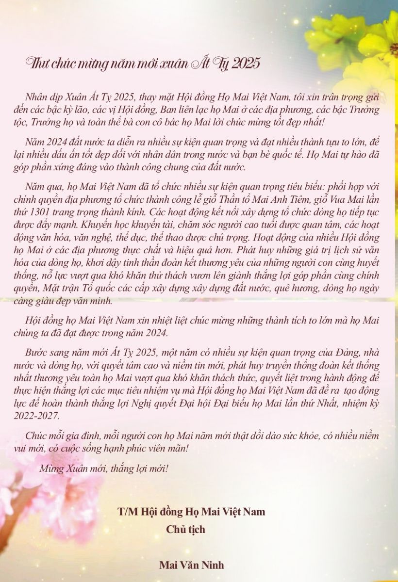Nhân dịp Xuân Ất Tỵ 2025, thay mặt Hội đồng Họ Mai Việt Nam, tôi xin trân trọng gửi đến các bậc kỳ lão, các Hội đồng, Ban liên lạc họ Mai ở các địa phương, các bậc Trưởng tộc, Trưởng họ và toàn thể bà con cô bác họ Mai lời chúc mừng tốt đẹp nhất!