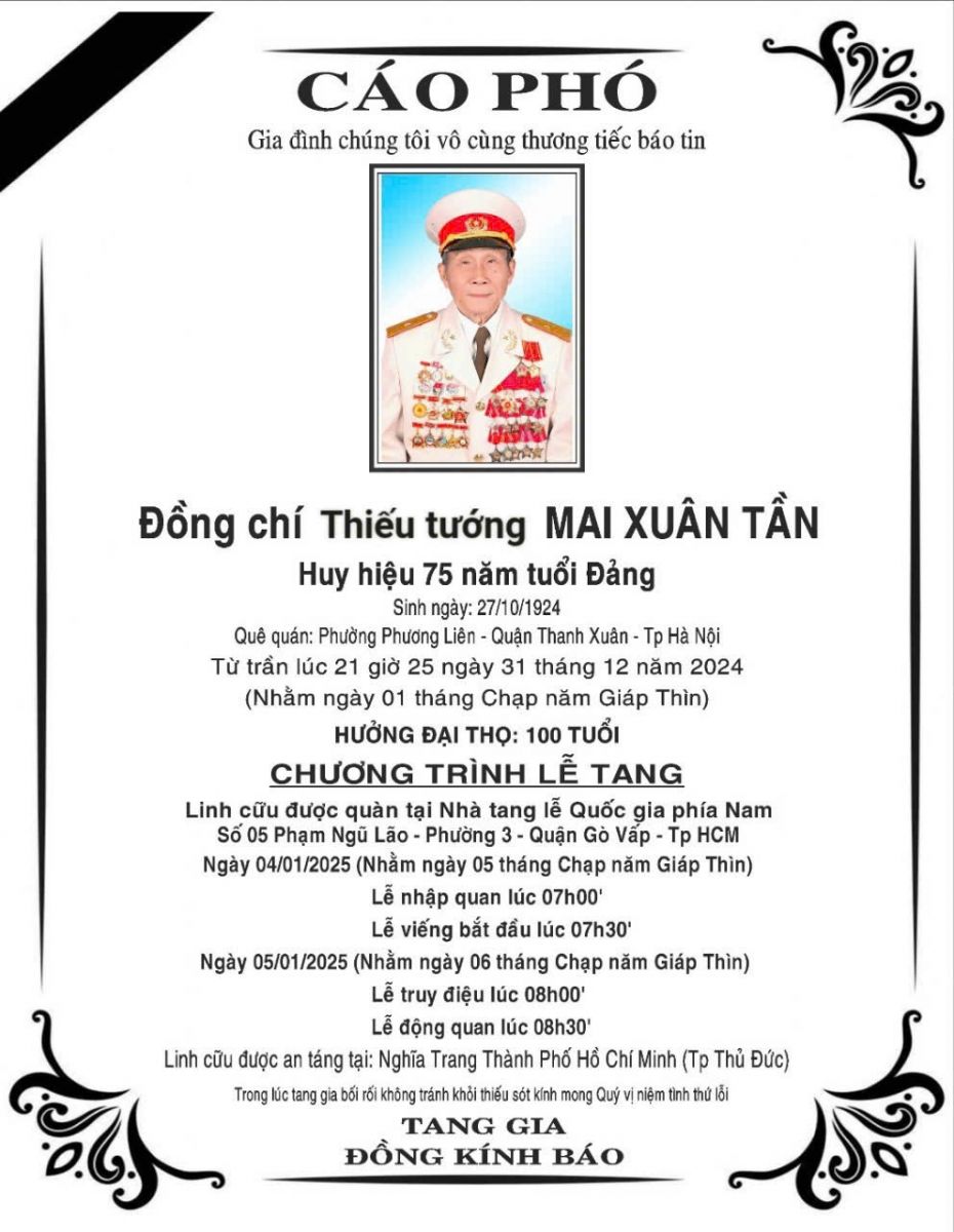 Mô tả: Thiếu tướng Mai Xuân Tần từ trần ngày 31 tháng 12 năm 2024