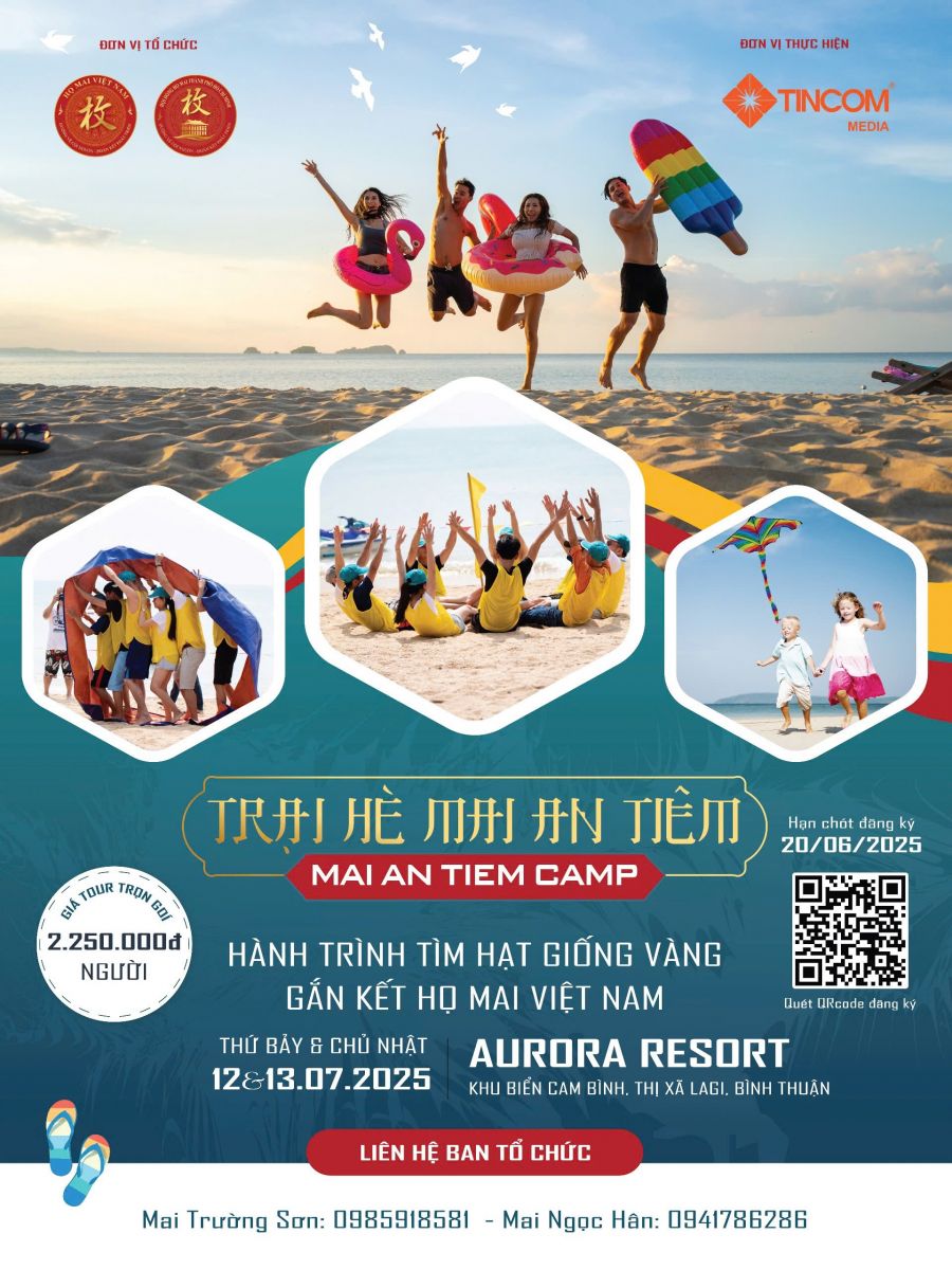 Trại hè Mai An Tiêm 2025 không chỉ là kỳ nghỉ, mà là hành trình trở về với cội nguồn – kết nối những thế hệ họ Mai – và truyền đi ngọn lửa của đam mê, tài năng và sáng tạo. ĐỪNG BỎ LỠ – GIA NHẬP NGAY!